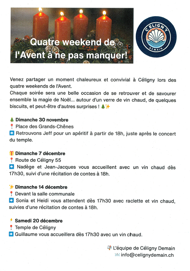 L'association Céligny Demain organise 4 weekends de l'Avent pour se retrouver et partager un moment chaleureux et convivial.