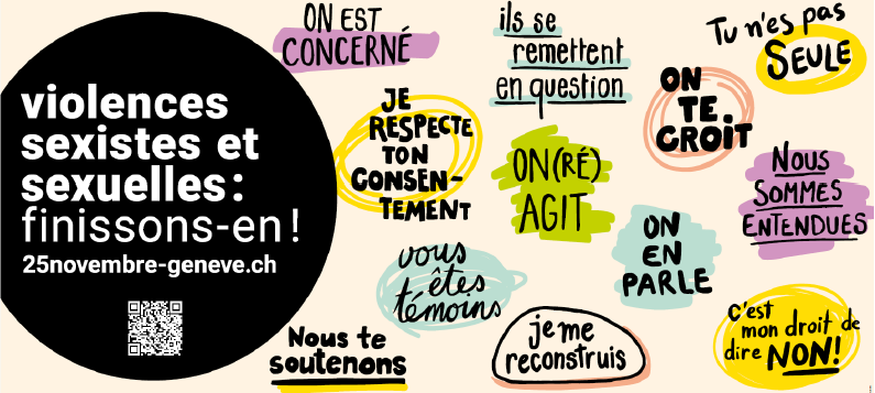 Plus d’information : En marge du 25 novembre, Journée internationale pour l’élimination des violences sexistes et sexuelles, le Canton et la Ville de Genève, avec des associations féministes et partenaires institutionnels, lancent la 3ᵉ édition de la campagne « Violences sexistes et sexuelles : finissons-en ! ». Du 13 au 30 novembre 2025, affichage public, événements et site internet mettront à disposition ressources et informations pour sensibiliser et appeler à une mobilisation collective.